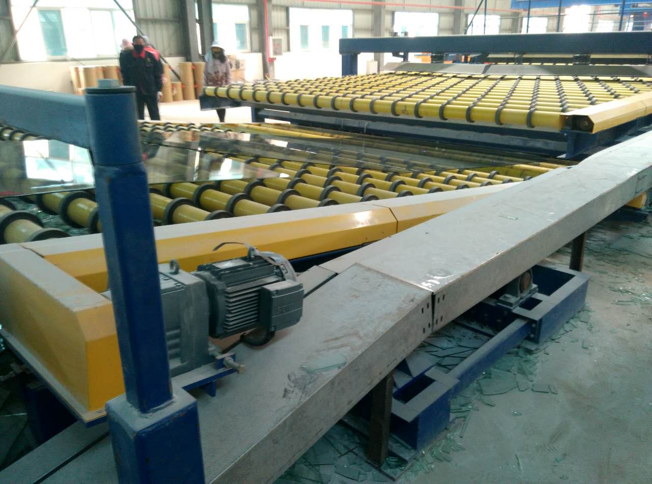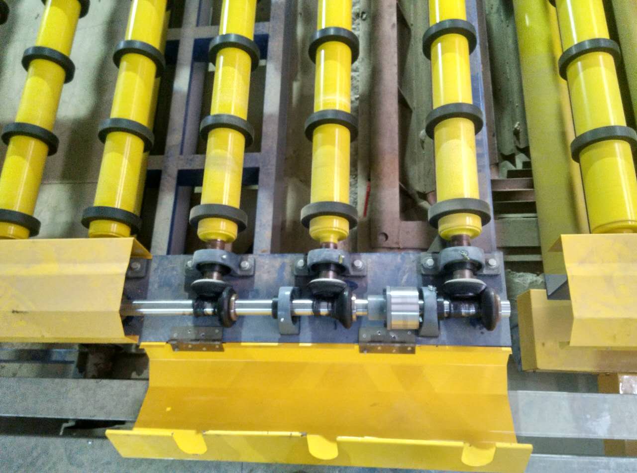 在云南云腾建材600吨浮法冷端项目上,玻机公司成功设计出末辊可超越式主线落板。该设备减少了末辊损坏周期,降低了对末辊的磨损。主要原理是在传动通轴上,末辊与倒数第二支辊子之间的位置断开,按照转速和转矩等参数设计了超越离合器。正常输送时,末辊如同普通辊子;需要落板时,超越离合器会实现末辊的线速度跟随主线接板辊道的线速度,从而减小因速度差导致的玻璃板对末辊的磨损。现该设备在云腾600吨冷端线上运转良好。