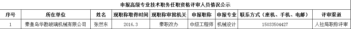 秦皇岛华勘玻璃机械有限公司申报中级专业技术职务任职资格评审人员情况公示