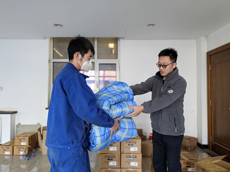 供应部长李梦男亲自为驻厂职工采购发放被褥